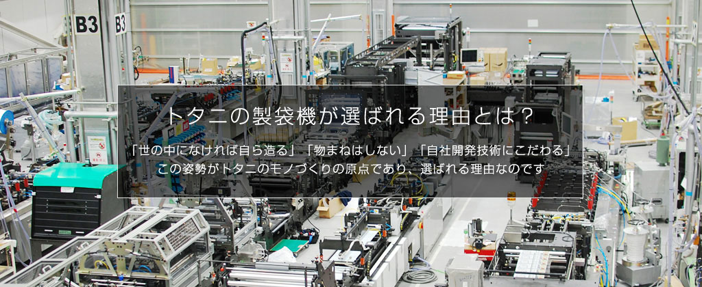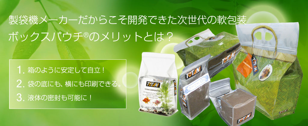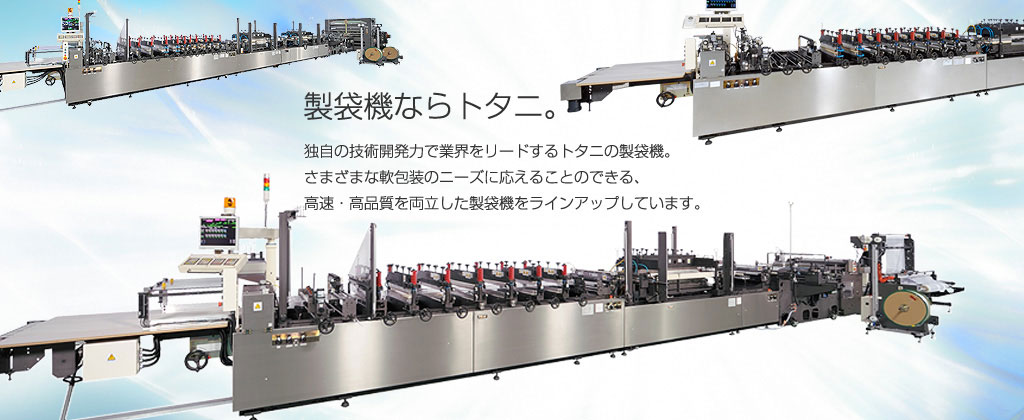 - 固形物だけでなく、液体の保存や運搬にも最適のトタニの小容量ボックスパウチ®製袋機に二列取りが登場。製袋速度も120ショット/分と従来機からさらに高速化を実現しています。高速稼動でありながら、高い生産性と高強度のシール加工を両立しています。