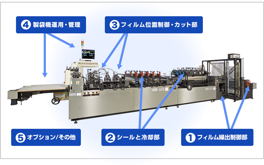 薄いプラスチックフィルムで高品質の袋を造るには、加工のためのさまざまな「しくみ」が必要です。トタニの製袋機には実は多くの独自開発の技術が盛り込まれています。CCD+画像処理制御による「シャー制御システム」、「シール時間設定機能」、パウダーブレーキ機構」etc…こうした独自の技術は、単に機能性や生産性を追求しただけではなく、お客様の視点に立って「モノづくり」を考えるという「トタニの開発コンセプト」を具現化したもの。ここではフィルムの繰出し側(上流側)から順に、仕様書や他社比の数値では見えてこないトタニの製袋機独自のしくみ=独自技術を紹介しています。