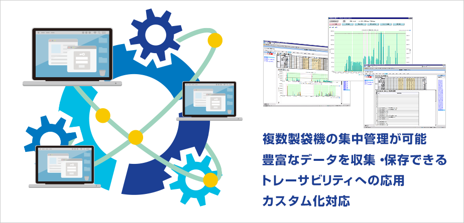 広域インターネット網(WAN)に接続されている複数の製袋機のデータ、例えば製袋条件やアラーム、温度変化などを記録することで、機械の不具合や不良袋の原因調査、過去の製袋条件の確認・再現を実現したい、というのがこのデータ通信システム開発の発端でした。