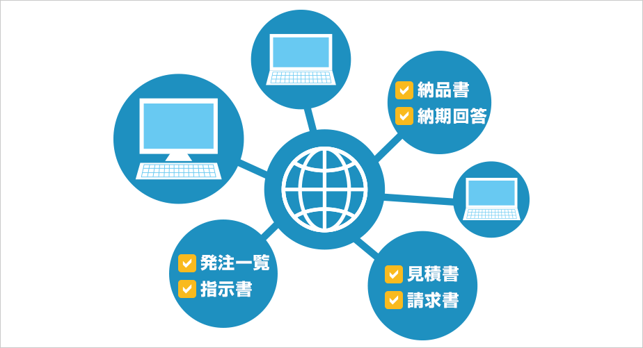 画面には「本日発注分・発注中」の一覧表示、「今後の発注予定」「発注図面」や「指示書」も見ることができます。また、これらに対し、協力工場からネット上で「納期回答」や「見積り」をすることが可能で、紙に書いてFAXや郵送する必要をなくしました。